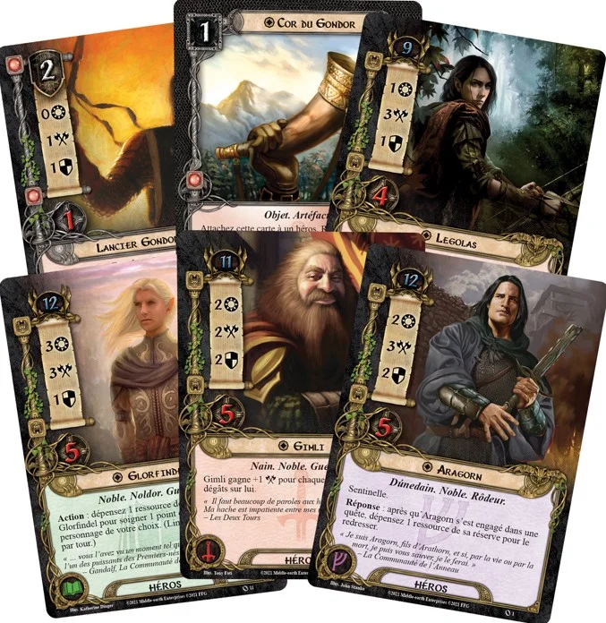 Lancez-vous dans un périple mythique jusqu’à 4 joueurs grâce à ce jeu de cartes évolutif. Choisissez votre héros parmi les 12 proposés et construisez chacun vos decks avec des cartes « alliés », des objets, des armes et des évènements… qui constitueront l’essence de votre gameplay. Les 3 scénarios permettent de constituer une petite campagne : Passage dans la Forêt Noire (difficulté 1, le parfait scénario d’initiation), Voyage le long de l’Anduin (difficulté 4), et Évasion de Dol Guldur (Difficulté 7). Chaque fin de scénario a une influence sur le suivant, jusqu’au bouquet final. Les combats y sont assez simples, on commence par l’attaque des ennemis (contrôlés par le jeu), puis celles des héros. Grâce à une mécanique bien huilée, vous progressez au fil des quêtes, en trouvant le bon équilibre entre les personnages engagés et ceux qui combattent ou défendent. Plusieurs extensions sont disponibles pour enrichir vos decks et prolonger l’aventure.