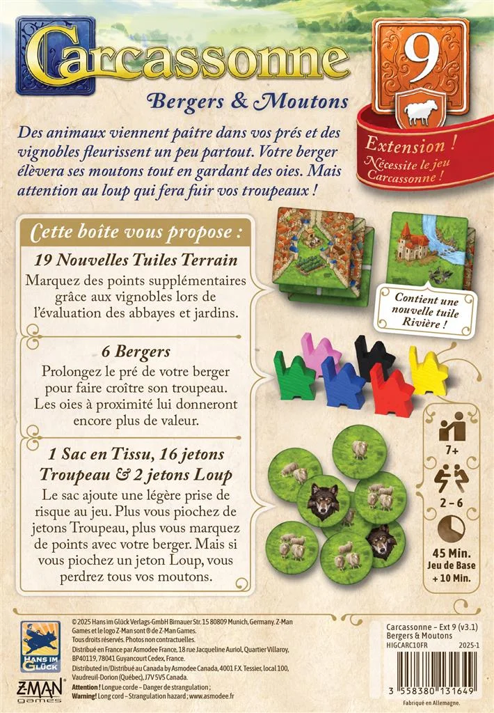 Avec l’extension Bergers & Moutons, installez des vignobles dans vos prés, puis laissez votre berger élever son troupeau de moutons pour amasser plus de points. Vous pouvez piocher 1 jeton dans le sac en tissu mais attention à ne pas prendre trop de risques : lorsqu’un jeton loup est tiré, tous vos moutons s’enfuient. Vous pourrez aussi élever des oies pour obtenir des points supplémentaires.