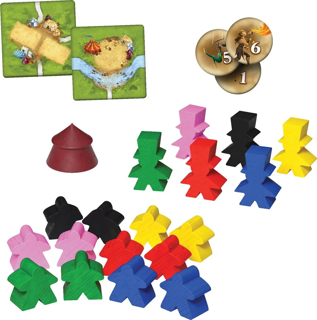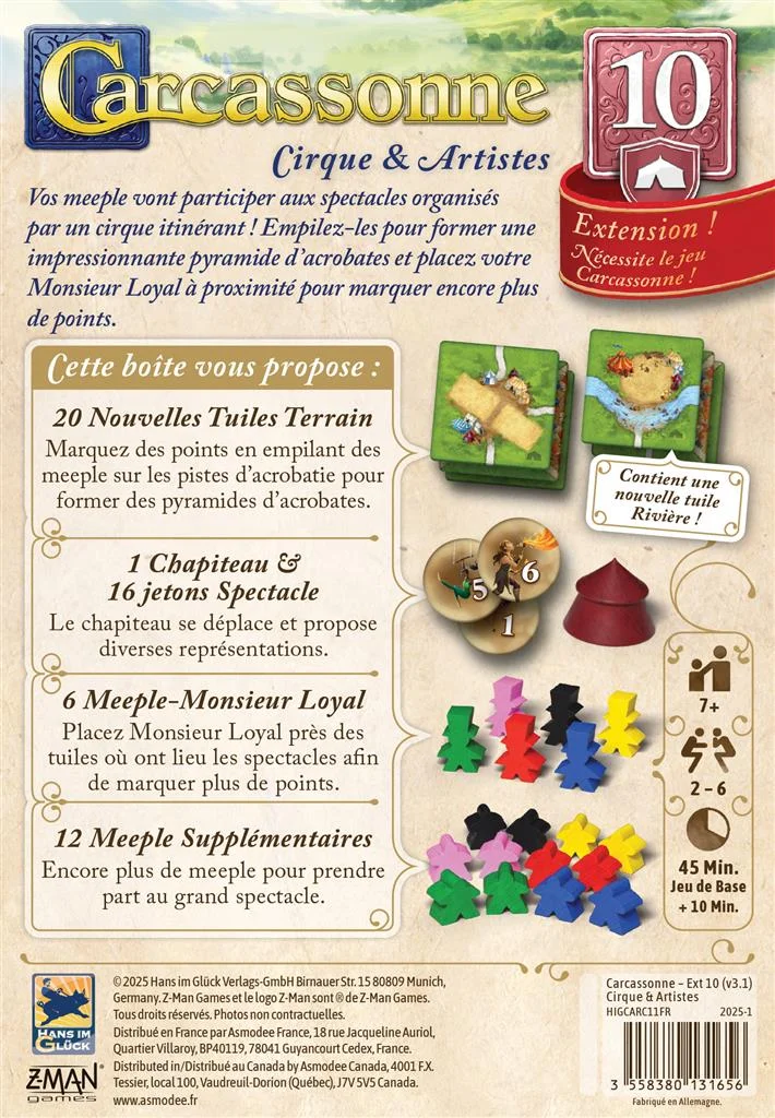 Avec l’extension Cirque & Artistes, vos meeple deviennent des artistes de cirque, prêts à se produire en ville, sur les routes ou les prés pour divertir la population… et vous faire marquer toujours plus de points ! Cette extension amusante repose sur deux mécaniques originales. D’abord, les tuiles Acrobatie vous permettent d’empiler vos meeple pour former une pyramide humaine. Dès que trois acrobates se retrouvent sur la même tuile, ils peuvent être évalués pour rapporter 5 points chacun. Ensuite, les tuiles avec piste de cirque accueillent un jeton Spectacle caché, qui sera révélé plus tard pour attribuer des points aux meeple situés autour.