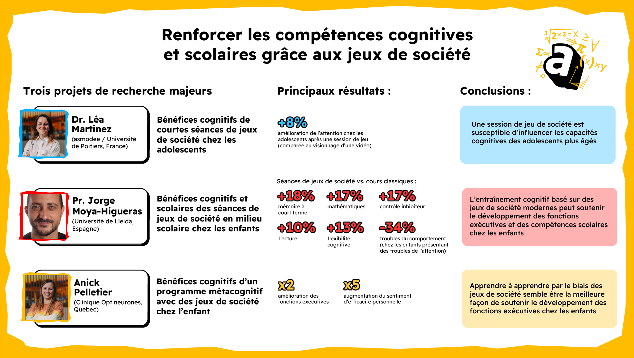 Pour démontrer les vertus du jeu de société sur le développement de l’enfant, Game in Lab a soutenu 3 projets de Recherche majeurs, dont on vous partage les résultats ci-dessous. Ces études prouvent que les jeux de société sont des alliés de choix pour renforcer les compétences cognitives et scolaires des enfants et des adolescents. Voici un résumé des bienfaits observés, qui portent aussi bien sur les performances, que sur les sentiments et les comportements.