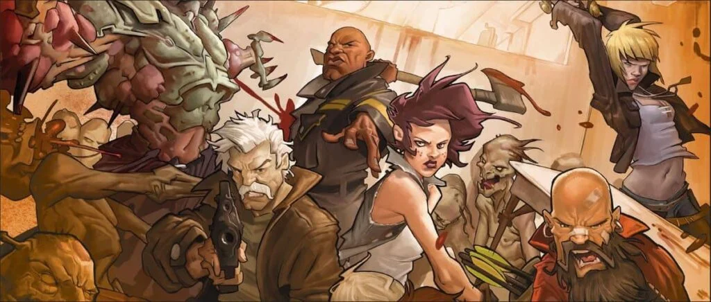 En 2013, Guillotine Games sortait la première édition du jeu de societe Zombicide, un jeu coopératif dans lequel un à six personnages joueurs travaillaient en équipe pour trucider du zombie. Le plateau est constitué de plusieurs dalles, agencées selon la mission, et représente une ville envahie par les morts-vivants. Les personnages doivent fouiller les lieux en quête d’équipement, tuer des zombies et remplir leurs objectifs de mission pour gagner.