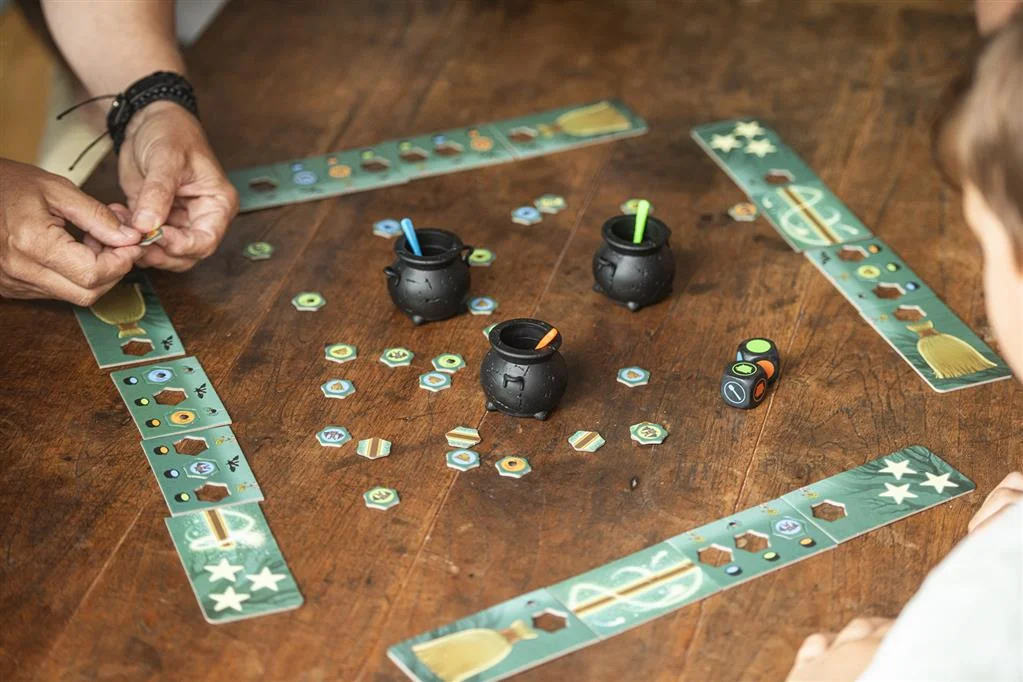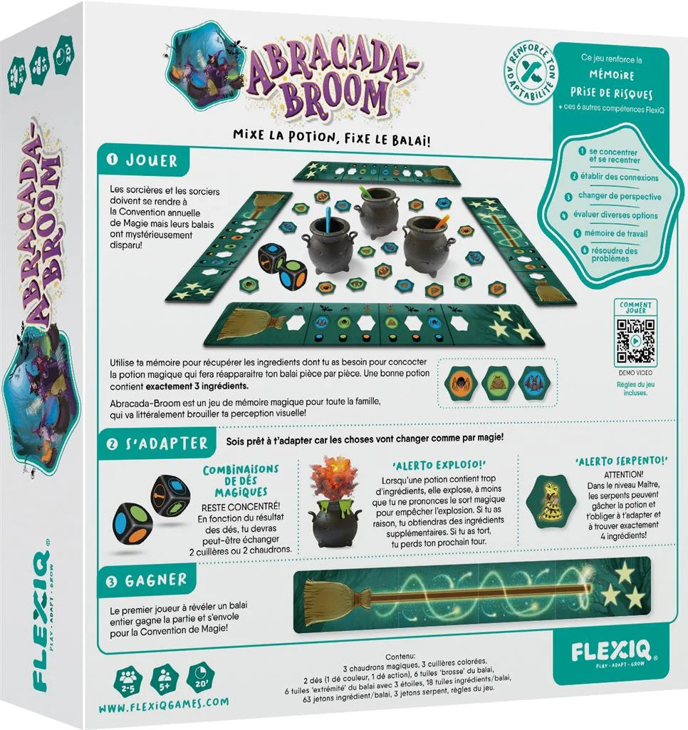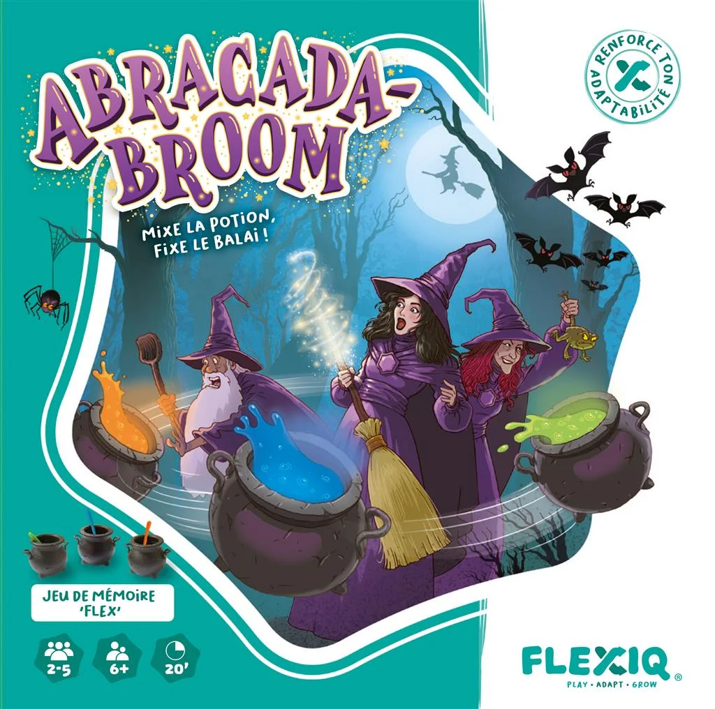 Répare ton balai en mélangeant les bons ingrédients dans ta potion. Dans Abracada-Broom, sorcières et sorciers doivent reconstituer leur balai grâce à des potions de trois ingrédients. Mémoire et tactique sont essentielles : les dés perturbent sans cesse le jeu en échangeant les chaudrons ou les cuillères ! Deux niveaux de difficulté, Apprenti et Maître, permettent à toute la famille de s’adapter. Gare aux potions explosives et aux serpents voleurs d’ingrédients !