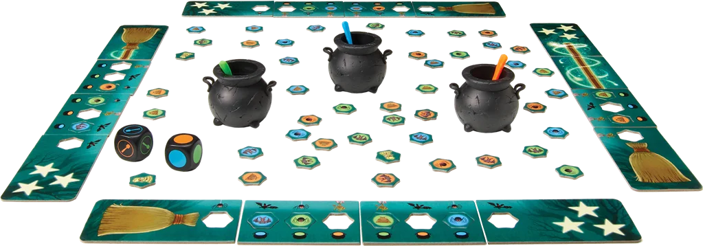 3 chaudrons magiques, 3 cuillères colorées, 2 dés (1 couleur, 1 action), 6 tuiles « brosse » du balai, 6 tuiles « extrémité » du balai, 18 tuiles ingrédient/balai, 63 jetons ingrédient/balai, 3 jetons serpent, règles du jeu, guide de jeu.