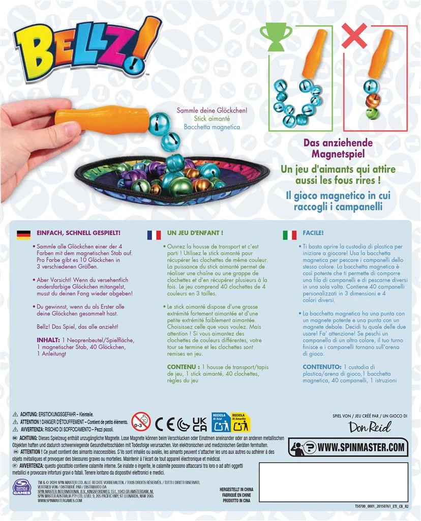 Ce jeu magnétisant et coloré va capter toute votre attention ! Capturez le plus vite possible les 10 clochettes de votre couleur à l’aide du stick aimanté, sans attirer les clochettes adverses. Le stick possède un gros et un petit côté pour pouvoir doser la puissance de l’aimant. Ce jeu d’adresse rigolo permet de travailler la motricité fine, la concentration et la patience. Avec ses règles super simples à apprendre et ses parties de 10 minutes, le jeu va séduire toute les générations. Son plateau de jeu se transforme en trousse de transport grâce à un zip malin : parfait pour pouvoir le ranger en quelques secondes et l’emmener partout avec vous.