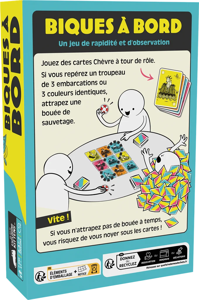 Biques à Bord est un jeu de rapidité, d’observation et de réflexes pour 2 à 6 joueurs dès 7 ans. À tour de rôle, chaque joueur pose une carte Chèvre dans une grille 3×3 au centre de la table (comme un jeu de morpion). Dès qu’une ligne, colonne ou diagonale affiche 3 cartes avec la même couleur ou le même type d’embarcation, tous les joueurs doivent se jeter sur les bouées de sauvetage disposées autour de la grille. Il y a toujours une bouée de moins que de joueurs… et celui qui reste les mains vides se noie sous les cartes supplémentaires !