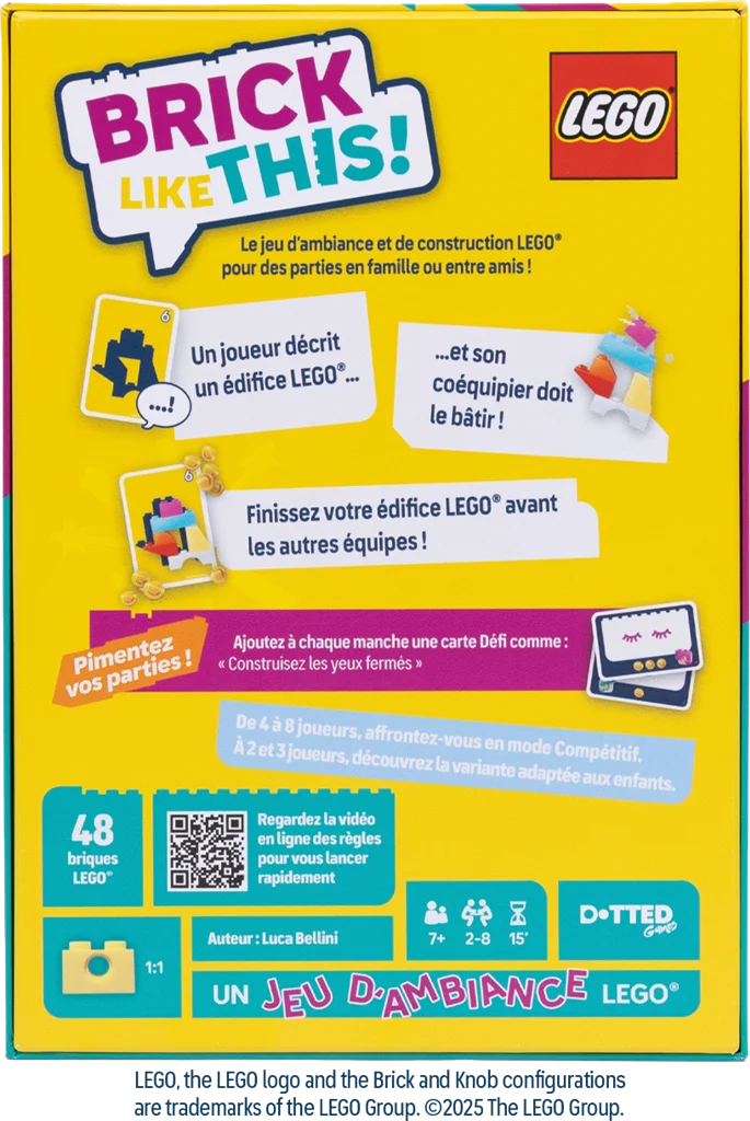 Un jeu de société frénétique où tous les joueurs jouent en même temps. Des équipes de deux joueurs doivent construire une forme spécifique à partir de briques LEGO. Vous devrez communiquer et collaborer, car la personne qui construit ne voit pas la forme qui doit être réalisée, elle écoute les instructions de son partenaire. Il n’y a que ce dernier, l’Instructeur, qui voit la forme sur la carte piochée.