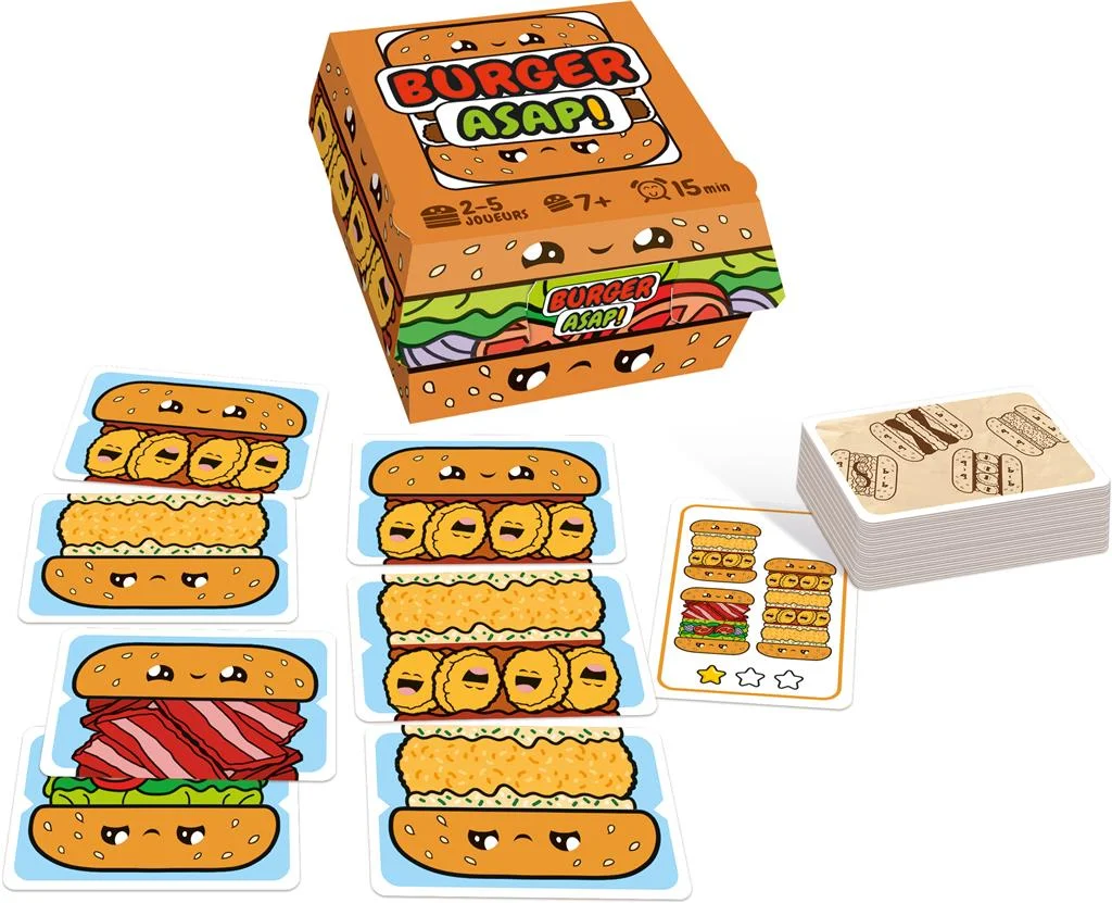 Dans ce jeu de coordination et de rapidité, prenez votre set de cartes d’ingrédients à double-face et commencez à faire des hamburgers !