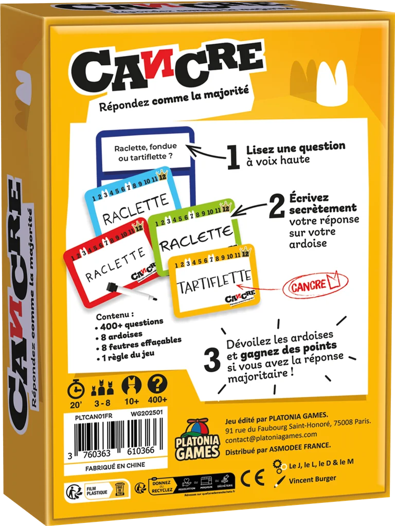 CANCRE est un jeu d’ambiance pour 3 à 8 joueurs autour d’un concept simple : répondre comme la majorité. À chaque tour, un joueur lit une question à voix haute (ex. : « Raclette, fondue ou tartiflette ? »). Les autres écrivent leur réponse secrètement sur leur ardoise. Ensuite, tout le monde révèle sa réponse.