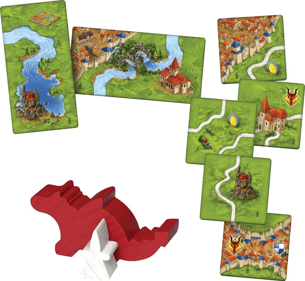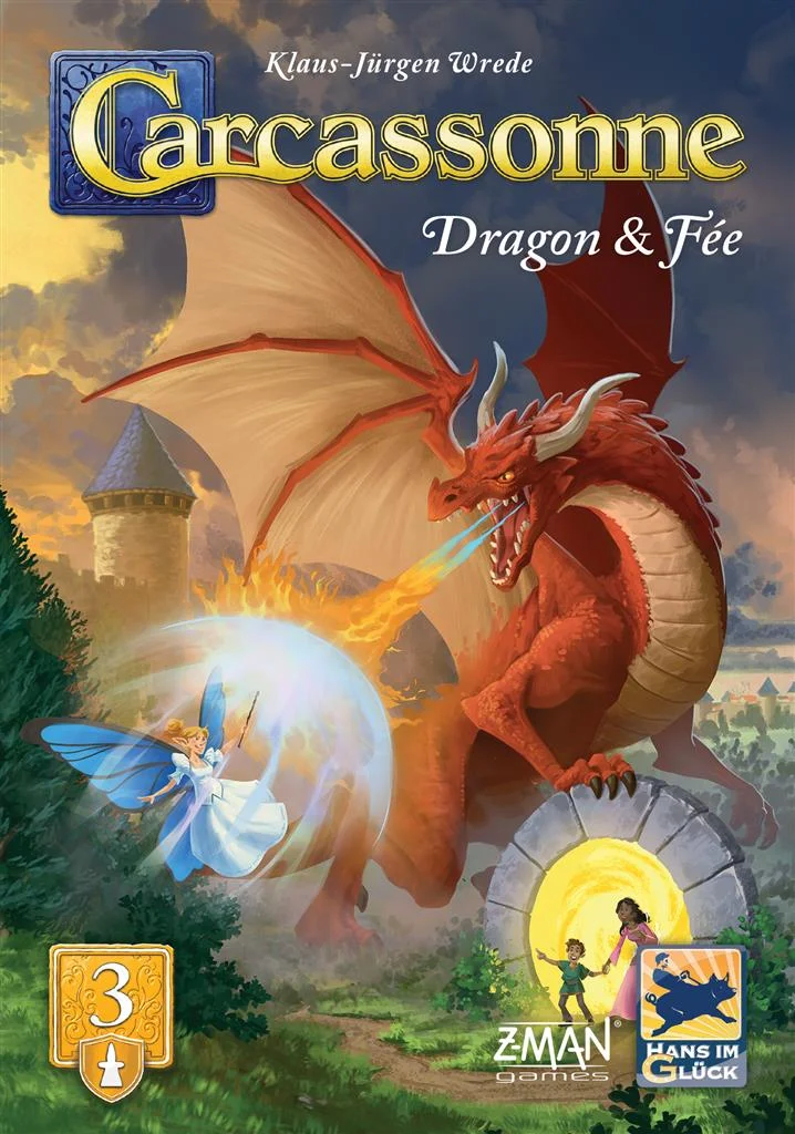 Avec l’extension Carcassonne Dragon & Fée, découvrez de nouvelles mécaniques. Anticipez les déplacements du dragon avant qu’il ne se réveille et ne dévore vos meeple. Heureusement, la fée vous aidera à les protéger. Avec la nouvelle tuile Source, la rivière s’écoule dans deux direction. La nouvelle tuile Lac abrite l’antre du dragon. Enfin, les portails magiques permettent de poser des meeple n’importe où : mais attention au symbole Dragon qui provoque le réveil de la bête.