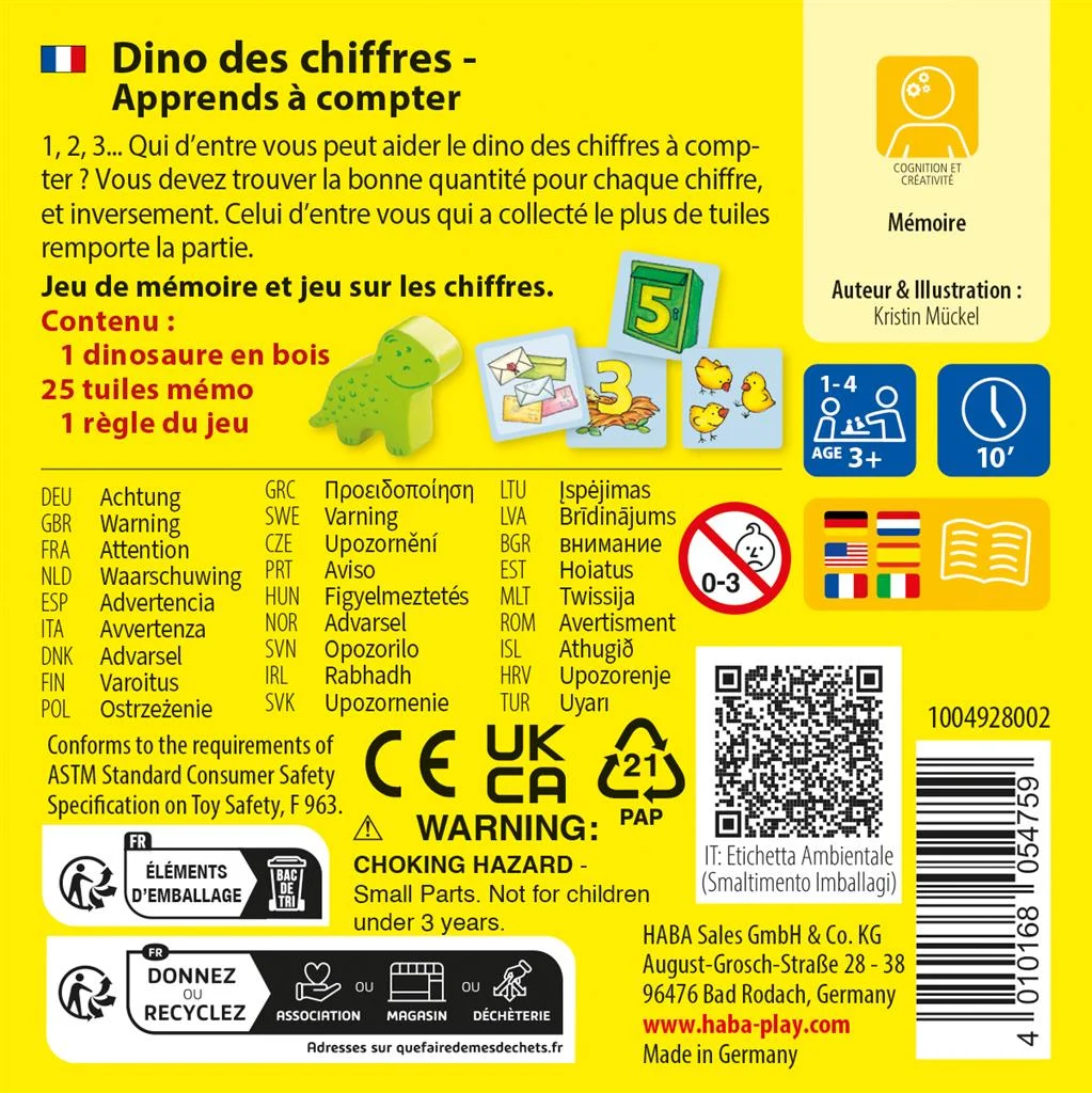 Dans Dino des chiffres, les enfants retournent les tuiles pour former les bonnes correspondances entre un chiffre et le nombre d’objets correspondant. À chaque paire trouvée, le joueur progresse et développe sa mémoire visuelle tout en se familiarisant avec les nombres de 1 à 10. Celui qui collecte le plus de tuiles remporte la partie.