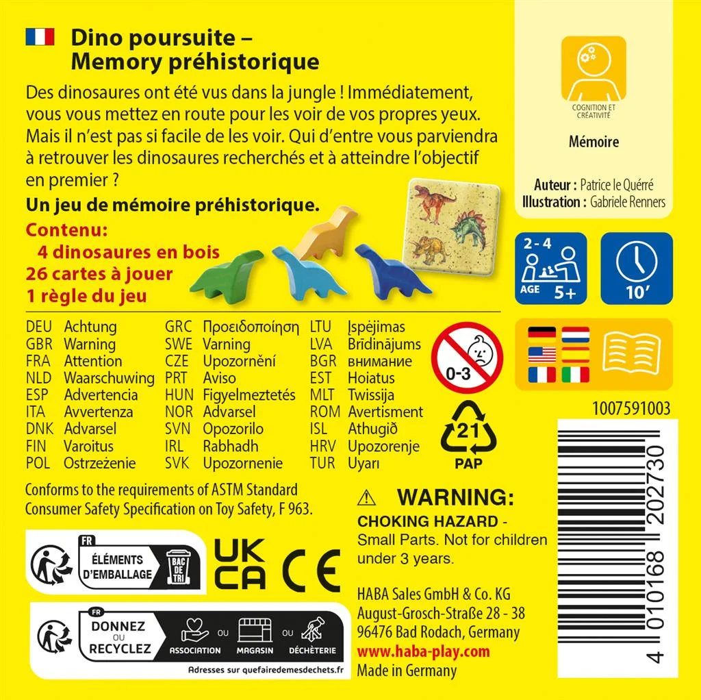 Une carte spéciale permet d’échanger deux cartes sans les regarder, ajoutant une dimension tactique. Ce jeu de mémoire rapide et rythmé stimule observation, concentration et sens de l’anticipation. Avec ses figurines en bois et son thème préhistorique captivant, Dino Poursuite vous embarque en famille dans une aventure ludique pleine de suspense.
