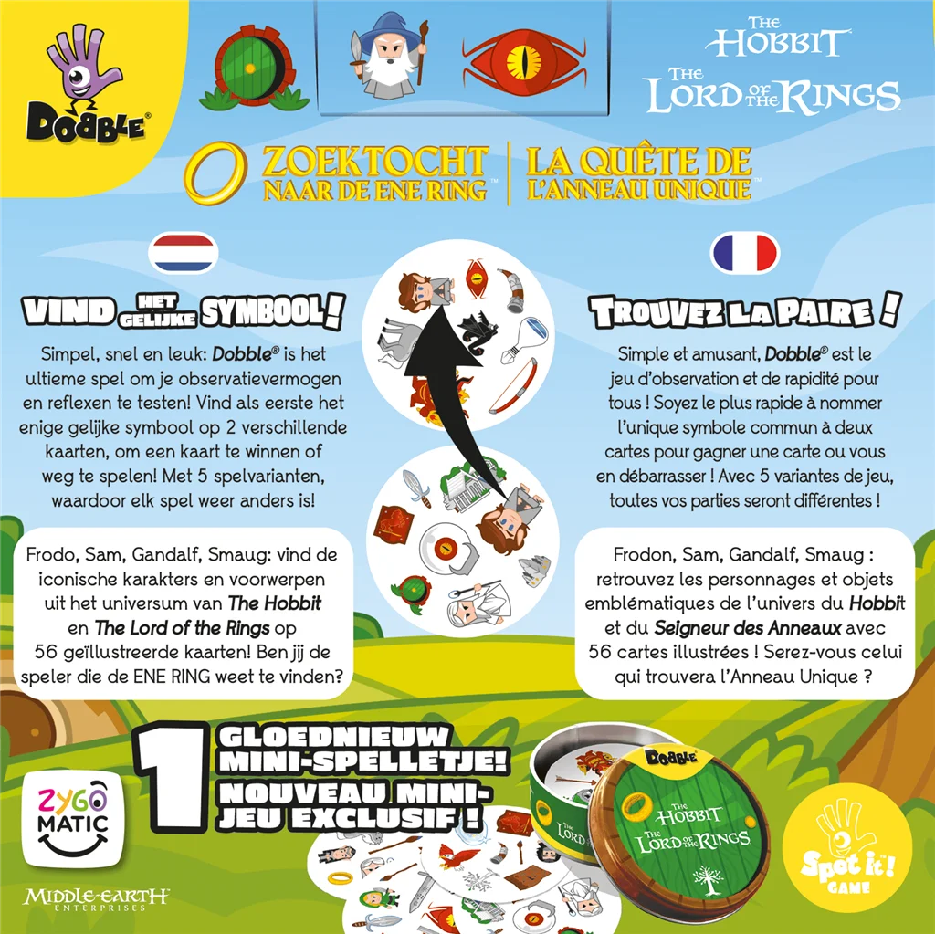 Avec Dobble Le Seigneur des anneaux - Le Hobbit, repérez le seul symbole identique entre deux cartes et soyez le plus rapide à scorer ! Tous les éléments et personnages...
