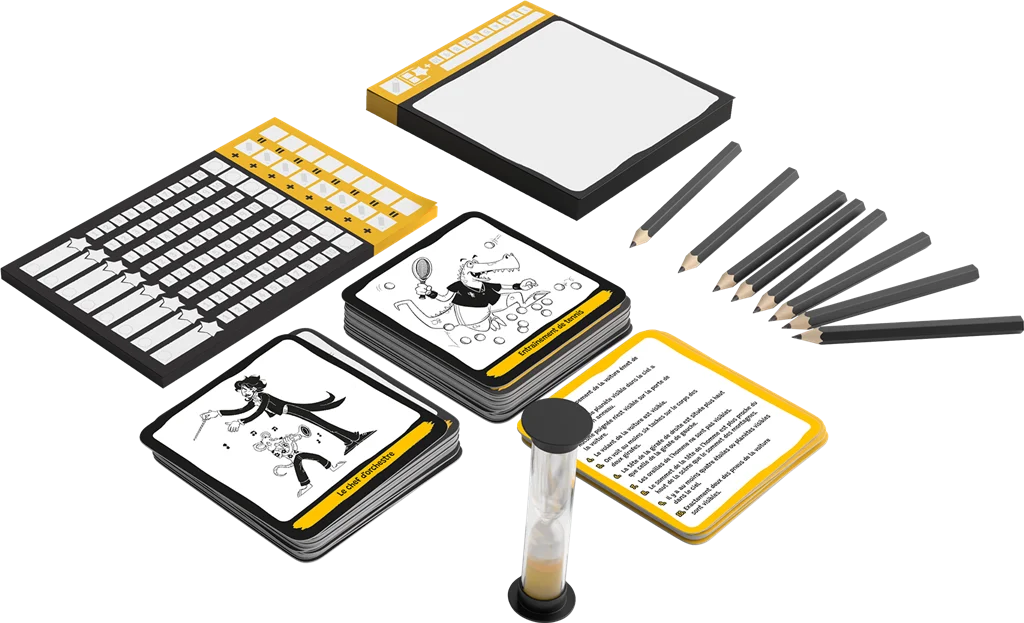 200 cartes, 8 crayons, 1 sablier, 1 carnet de score, 1 rodoïde rouge, 1 livret de règles