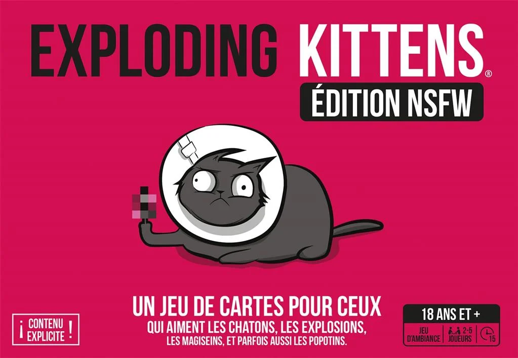 Cette édition NSFW propose les mêmes règles, mais un contenu très différent avec une sélection de cartes plus explosives que jamais, à ne pas mettre entre toutes les mains et sous les yeux des plus jeunes ! Une boîte pour un public averti qui aime les chats, les explosions, les magiseins et les popotins.