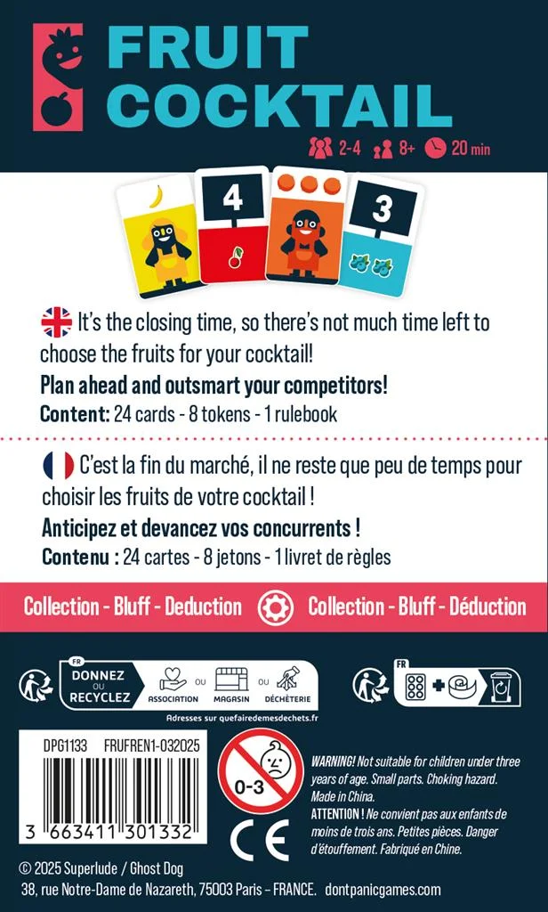 Accessible dès 8 ans, Fruit Cocktail est parfait pour des parties en famille ou entre amis. Facile à expliquer, rapide à jouer (15–20 min), il offre une forte rejouabilité grâce à l’aléatoire des fruits et ses deux variantes incluses.
