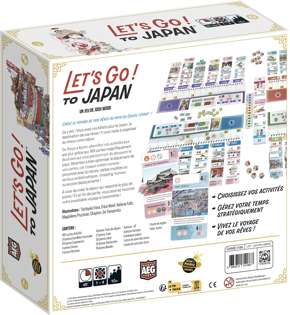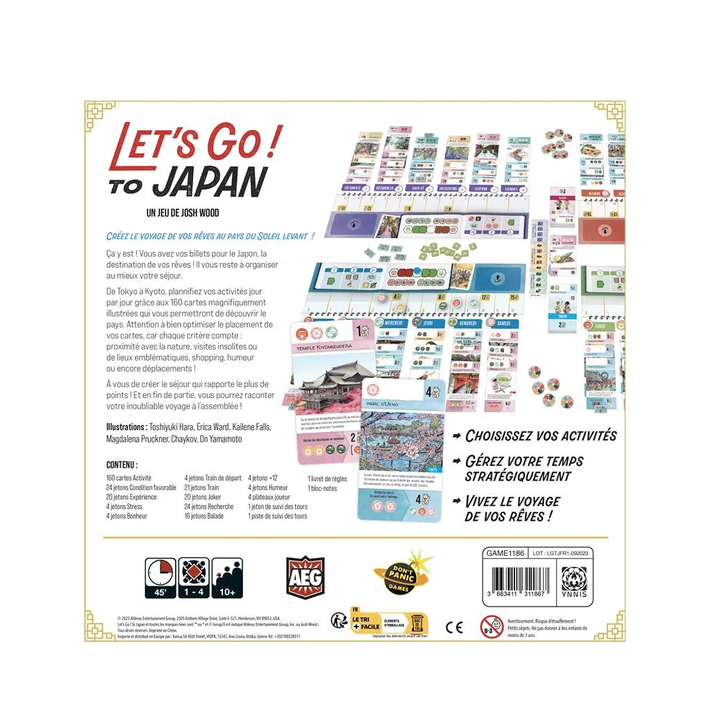 Dans Let’s Go ! To Japan, les joueurs sont des voyageurs qui essayent de planifier et de vivre les meilleures vacances possible à Tokyo et à Kyoto. Le jeu se déroule en 13 tours au cours desquels les joueurs piochent des cartes Activité qu’ils placent de manière stratégique sur les différents jours de leur semaine. Puis, au dernier tour, c’est l’heure de partir ! Ils activent chacune des cartes dans l’ordre de leur itinéraire. Le joueur ayant récolté le plus de points à la fin du voyage remporte la partie !