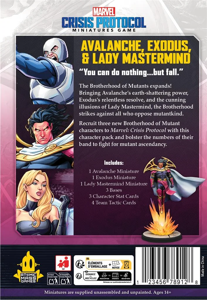 La Confrérie des Mutants s’agrandit ! Elle se renforce avec la puissance d’Avalanche, la détermination implacable d’Exodus et les illusions subtiles de Lady Mastermind, afin de combattre tous ceux qui s’opposent aux mutants. Ce Set de Personnages vous permettra d’ajouter trois nouvelles figurines de la Confrérie des Mutants à vos parties de Marvel : Crisis Protocol afin de renforcer vos escouades qui cherchent à affirmer la supériorité des mutants !Figurines à monter et non peintes.