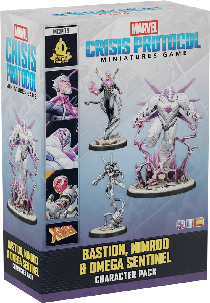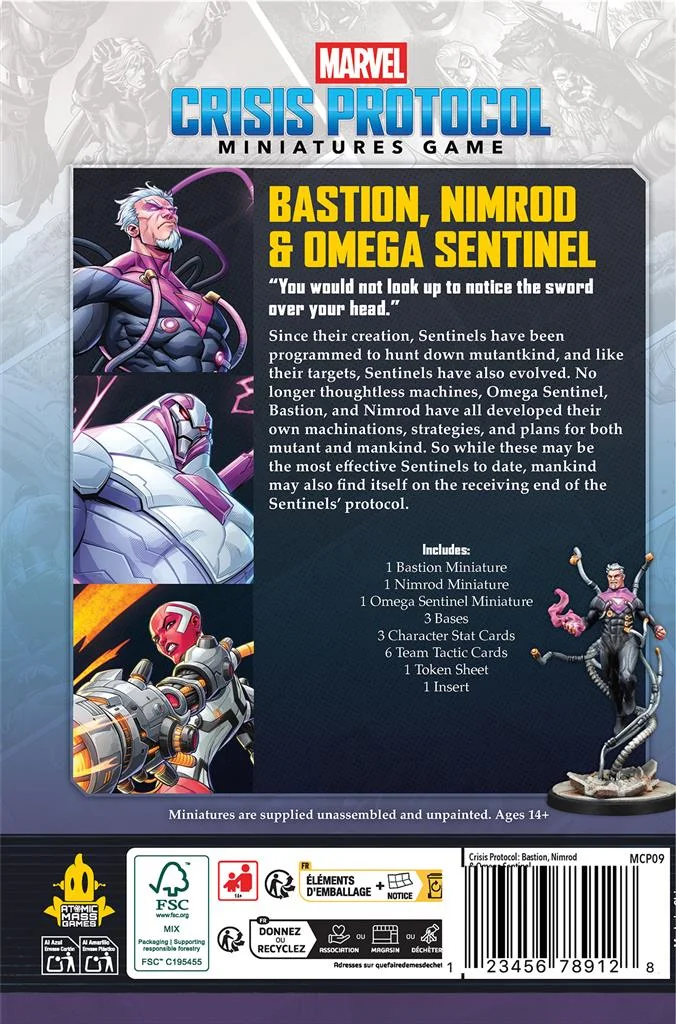 Cette extension pour contient trois nouveaux personnages pour le jeu d’escarmouches de figurines Marvel : Crisis Protocol™ : Bastion, Nimrod et Sentinelles Omega. Créés pour traquer les mutants, tout comme leurs proies elles ont évolué au fil du temps. En tant que machines conscientes, Sentinelle Omega, Bastion et Nimrod ont développé leurs propres machinations, stratégies et projets impliquant les mutants et l’humanité. Et même si ces Sentinelles sont actuellement les plus efficaces qui soient, l’humanité pourrait devenir à terme la cible de leurs protocoles. Ce pack double presque le nombre de personnages disponibles pour l’affiliation Sentinelles.