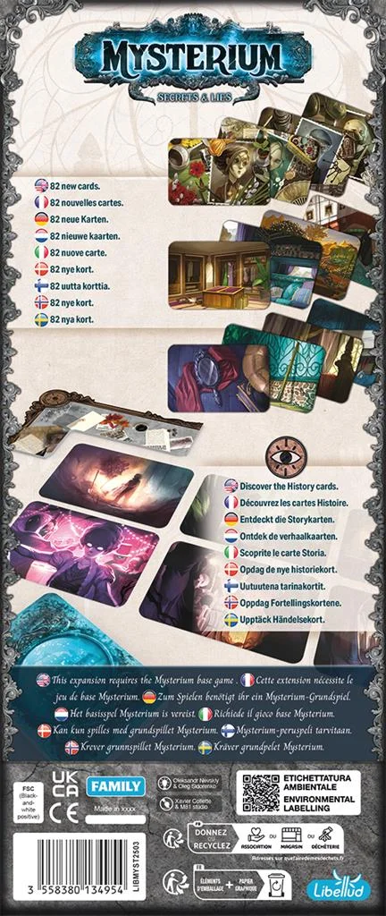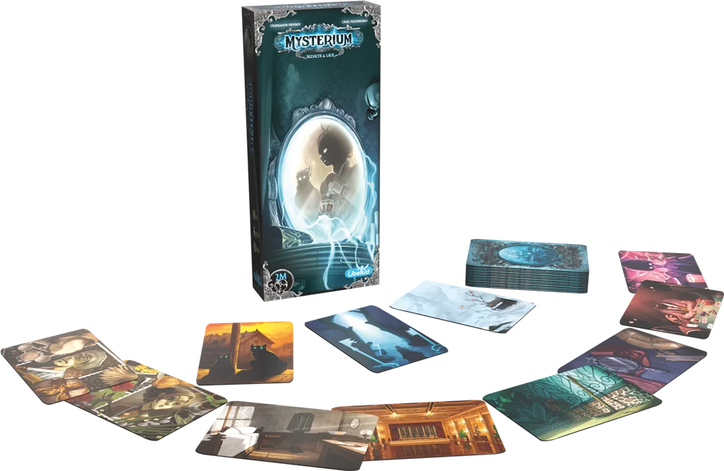 Dans l’extension « Secrets & Lies » (Secrets et Mensonges) découvrez encore plus de cartes inédites pour renouveler vos parties de Mysterium. 6 personnages, 6 lieux et 6 objets inédits viendront renforcer la liste des options possibles. Le fantôme pourra communiquer sur son triste destin grâce à 42 nouvelles visions illustrées. Cette extension vous propose aussi une nouvelle manière de jouer, avec 18 cartes Histoire. Ses cartes remplacent les cartes Objet : dans cette version, vous allez chercher le mobile du crime plutôt que l’arme. De nouvelles heures de jeu à tenter de percer les mystères du manoir Warwick vous attendent. Cette extension n’ajoute pas de nouvelles règles. Il n’est pas nécessaire de posséder l’autre extension pour jouer, en revanche le jeu de base Mysterium est nécessaire.