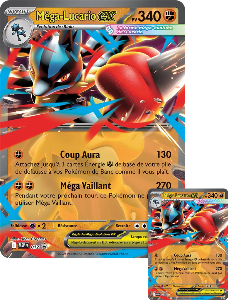1 carte promo texturée brillante de Méga-Lucario-ex , 1 carte promo grand format de Méga-Lucario-ex , 1 figurine de Méga-Lucario , 5 boosters du JCC Pokémon , 1 carte à code pour le JCC Pokémon Live