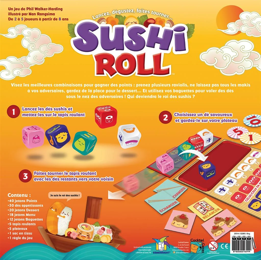 Lancez les dés sushis et mettez-les sur le tapis roulant, choisissez un dé savoureux et gardez-le sur votre plateau et faites tourner le tapis roulant avec les dés restants vers votre voisin ! Visez les meilleures combinaisons pour gagner des points : prenez plusieurs raviolis, ne laissez pas tous les makis à vos adversaires, gardez de la place pour le dessert… Et utilisez vos baguettes pour voler des dés sous le nez des adversaires !