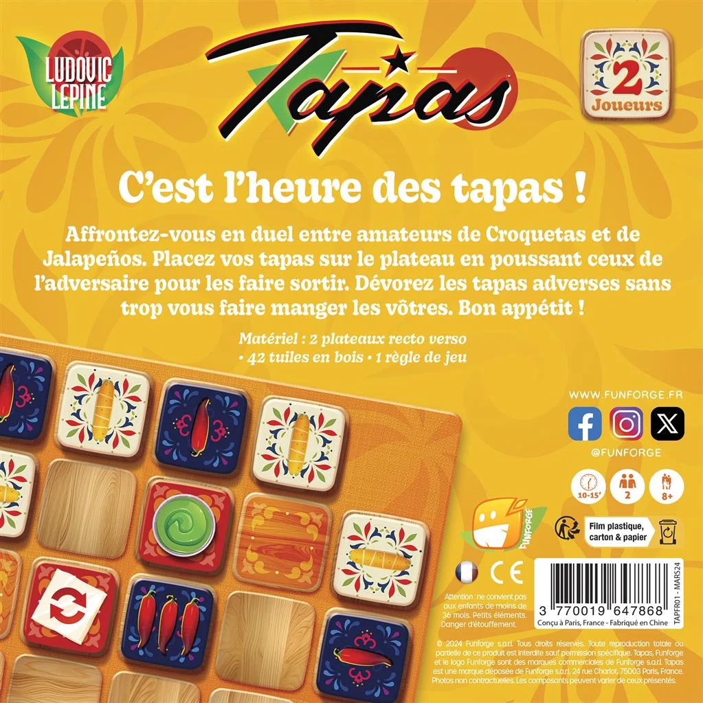 Tapas vous propose une compétition entre amateurs de Croquetas et amateurs de Jalapenos. Votre but est de placer vos tapas sur le plateau tout en poussant ceux de votre adversaire.