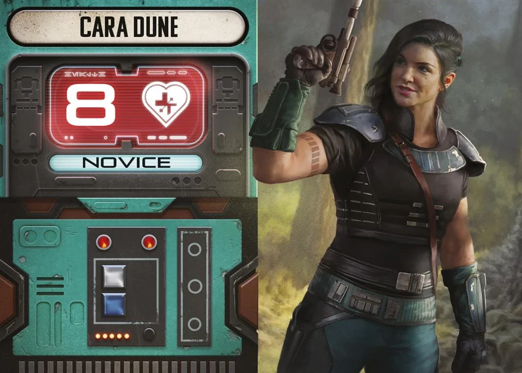Choisissez un personnage : le Mandalorien, IG11, Paz Vizsla, Burg, Migs Mayfeld, Xi’An, Cara Dune ou Greef Karga, chacun doté de son propre paquet de cartes.