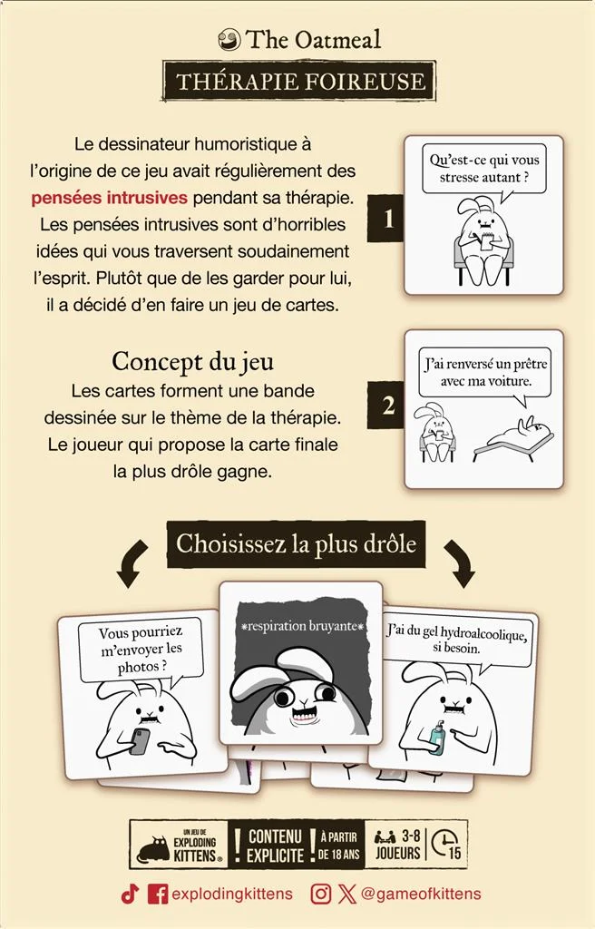 Conçu par The Oatmeal (le célèbre auteur de BD) et les créateurs d’Exploding Kittens, Thérapie Foireuse est un jeu à l’humour noir délibérément trash, réservé aux adultes. Avec plus de 400 cartes, chaque partie est unique. Âmes sensibles s’abstenir ! Les autres s’amuseront…comme des petits fous !