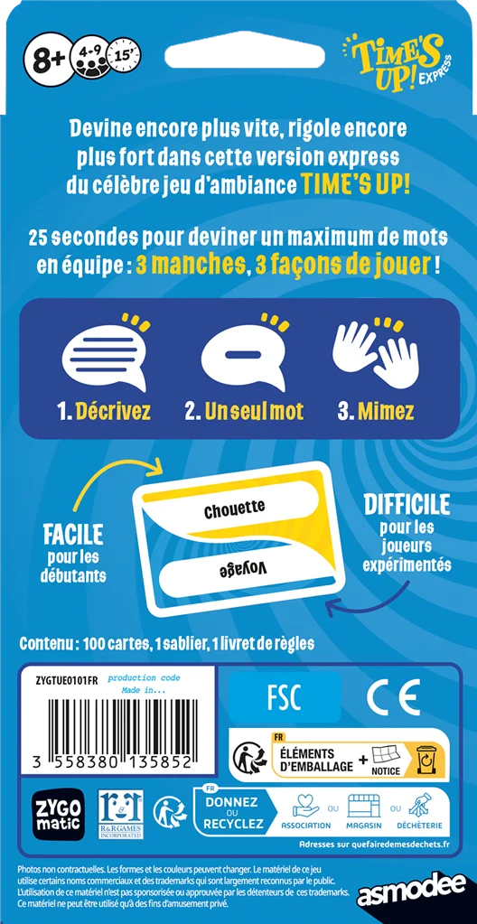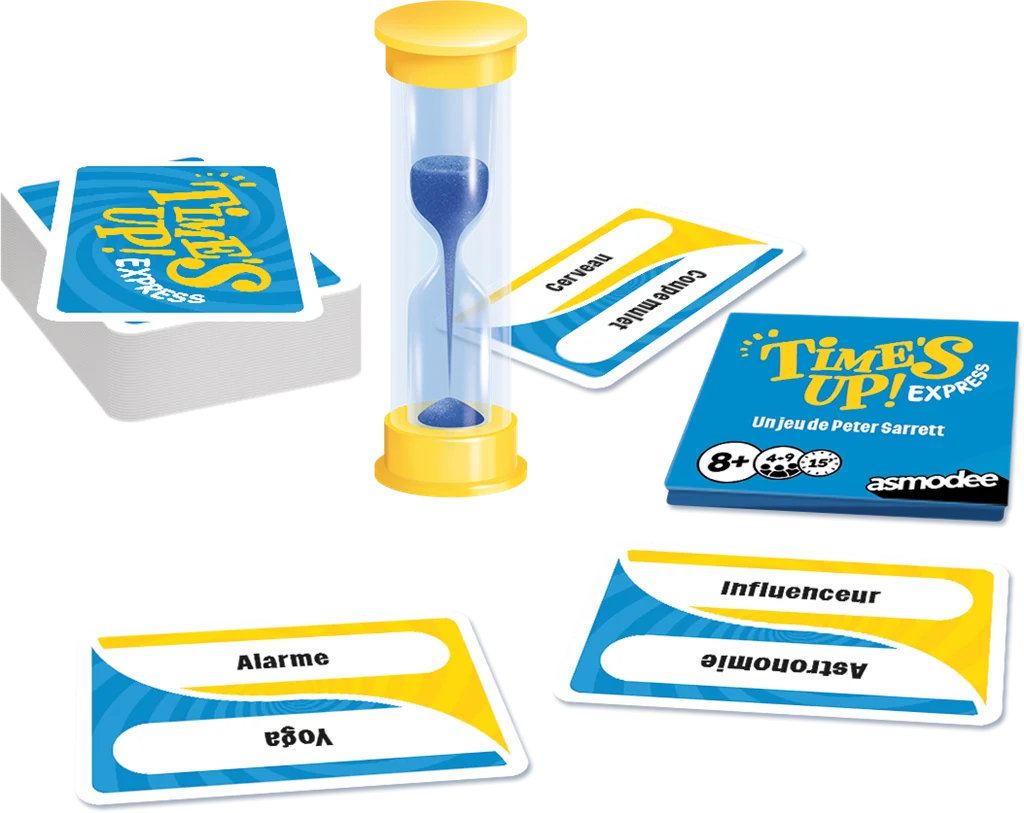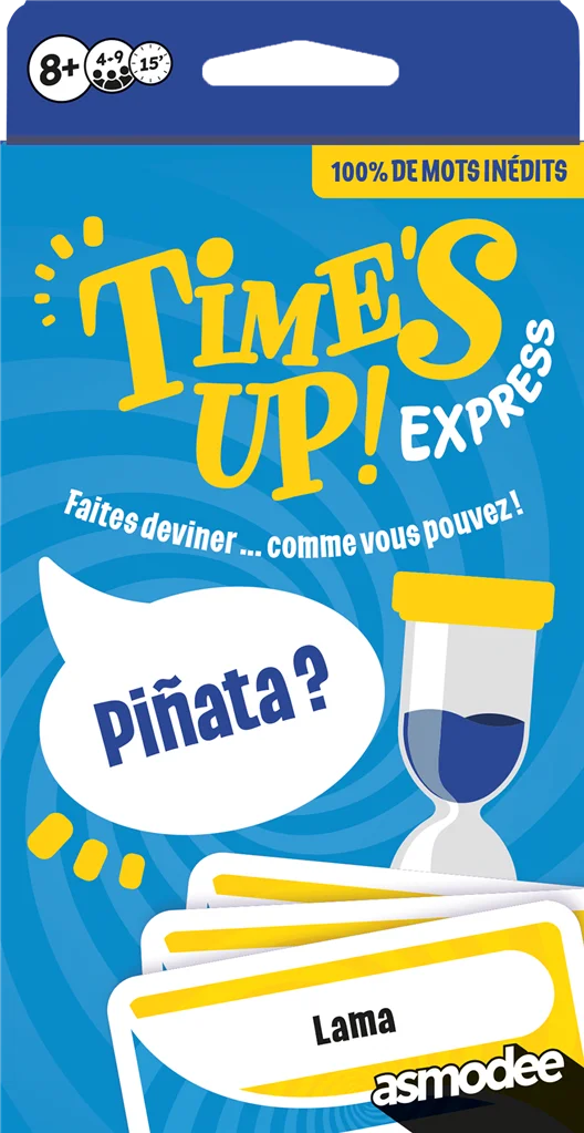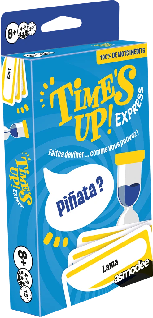 Voici la version Express du best-seller des jeux d’ambiance. Pas besoin de savoir encyclopédique pour s’amuser : un peu d’astuce, d’attention et de mémoire et le tour est joué ! Time’s Up express se joue en équipe en 3 manches et le but est toujours de deviner un maximum de cartes : d’abord en décrivant le mot sans le nommer, puis à l’aide d’un seul mot et enfin en mimant. Découvrez dans cette version plus de 200 mots, avec des thèmes inédits et tendance qui vous garantissent des moments mémorables en famille et entre amis. Le temps de jeu a été légèrement raccourci et chaque joueur possède moins de cartes au départ, pour vous permettre d’enchaîner les tours et les parties à un rythme effréné. N’oubliez pas de reprendre votre souffle entre 2 fous rires ! Son format pocket nomade permet de l’emporter partout avec vous, notamment en vacances. Histoire d’improviser une partie quand vous en avez envie : dans le train, à l’aéroport, à la plage ou chez des amis…