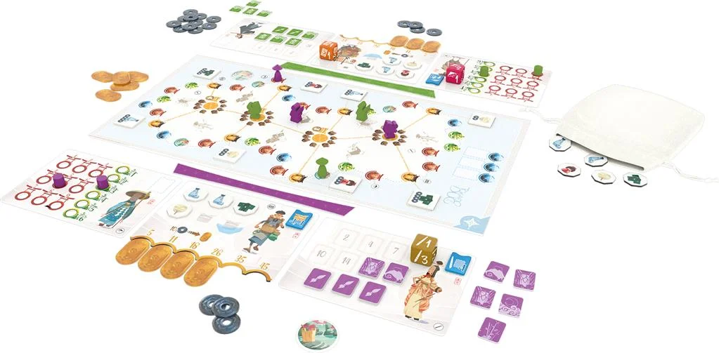 1 plateau de jeu, 6 plateaux Personnage, 6 fiches Personnage, 6 pions Personnage, 8 jetons Commerce, 26 jetons Marchandise, 20 jetons Œuvre, 4 marqueurs Visite, 2 repères de couleur, 1 jeton Source chaude, 3 jetons Vague, 20 pièces, 12 plaquettes d’or, 1 sac en tissu, 3 dés, 9 cartes Automa, 1 livret de règles, 1 livret solo, 9 cartes Aventure.