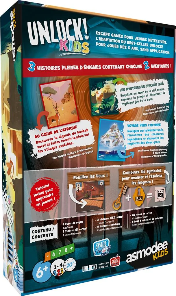 Trois histoires pour six nouvelles aventures qui entrainent enfants et parents en Afrique, chez les Mayas et vers l’Olympe ! Cette version d’Unlock! est totalement pensée et conçue pour les enfants à partir de 6 ans : ni calculs, ni textes, ni écran, ni connexion, elle fait la part belle au plaisir et à la réflexion.