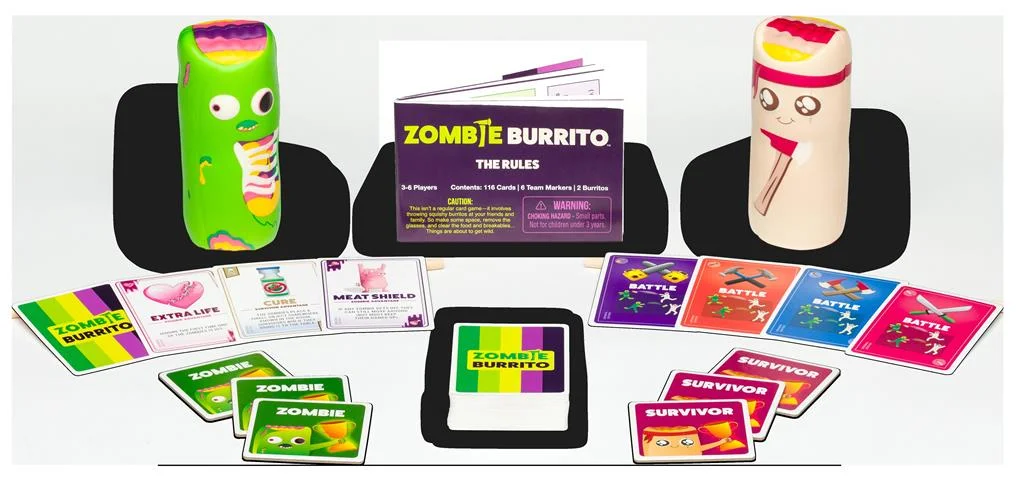 Plus c’est le chaos, plus c’est rigolo ! Cela pourrait être la devise de Zombie Burrito. Ce jeu d’ambiance fait s’affronter une équipe de Zombies et une équipe de Survivants (tirage au sort). Commencez par faire de la place autour de vous et rangez tous les objets fragiles, ça va déménager ! Chaque joueur reçoit une pioche de 15 cartes, prend les 5 premières cartes puis, au signal, tout le monde joue en même temps et s’échange les cartes le plus vite possible. L’objectif : réunir des triplettes, 3 cartes identiques qui vous donneront des avantages durant les combats, ou provoqueront un duel ! Utilisez alors vos burritos en mousse, vous en avez un par équipe : le but est de toucher tous les adversaires de l’équipe adverse pour gagner le combat. Comme dans une « balle au prisonnier », les esquives sont autorisées et vous pouvez attraper le burrito au vol pour éliminer le lanceur. Si vous remportez 3 duels, vous gagnez la partie.